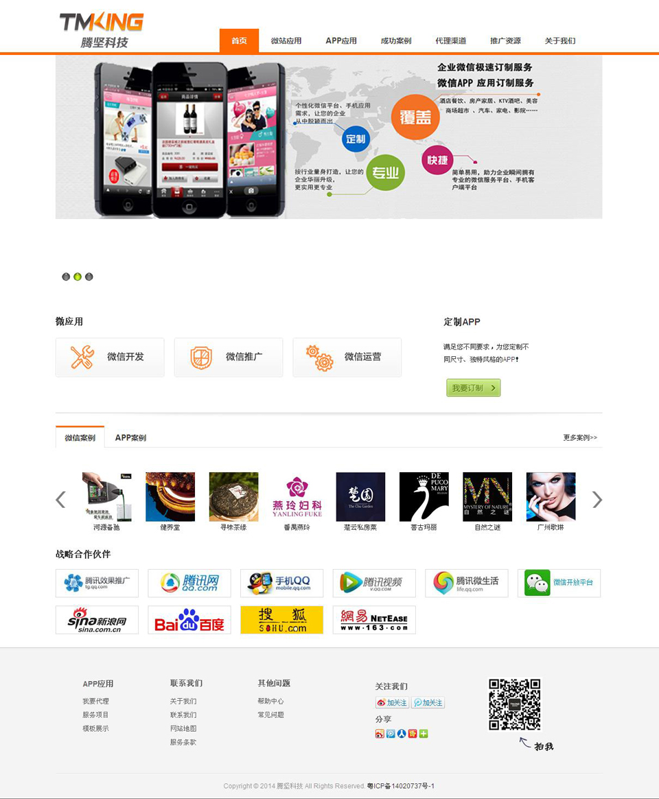 廣州騰堅信息科技有限公司,是一家專業(yè)從事于移動互聯(lián)網(wǎng)產(chǎn)品開發(fā)的高新科技企業(yè),旨在幫助企業(yè)、個人能簡單、快速、廉價、高效地建設自己滿意的移動營銷平臺,輕松涉足移動互聯(lián)網(wǎng),把握未來。是國內(nèi)領先的在線應用開發(fā)平臺,提供自建、定制、發(fā)布、管理一站式服務。通過SaaS模式(軟件即服務的模式)向用戶提供服務,大大降低了應用的開發(fā)、維護成本,同時通過一次開發(fā)全平臺(IOS/Android/手機網(wǎng)站)適配的創(chuàng)新技術(shù),大大提升了開發(fā)效率。本公司管理層曾任職于各大互聯(lián)網(wǎng)公司:騰訊、百度、新浪等有著廣泛的合作。