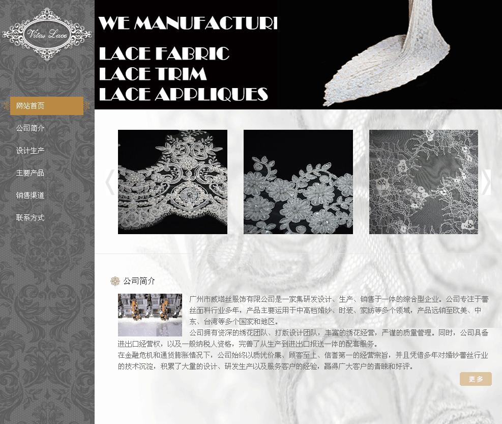廣州市威塔絲服飾有限公司是一家集研發(fā)設(shè)計(jì)、生產(chǎn)、銷售于一體的綜合型企業(yè)。公司專注于蕾絲面料行業(yè)多年,產(chǎn)品主要運(yùn)用于中高檔婚紗、時(shí)裝、家紡等多個(gè)領(lǐng)域,產(chǎn)品遠(yuǎn)銷至歐美、中東、臺(tái)灣等多個(gè)國家和地區(qū)。