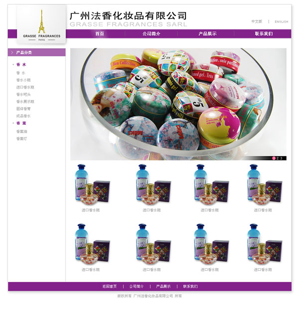 項目名稱:廣州法香化妝品有限公司網站建設簽定日期:2009年10月9日廣州法香化妝品有限公司是由位于法國“香精之都”格拉斯的GRASSEFRAGRANCES香精公司2004年在中國成立的分公司,集科研、生產、銷售及OEM,ODM代加工貼牌生