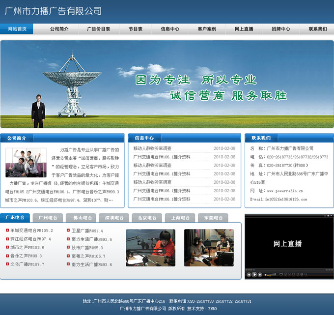 項目名稱:廣州市力播廣告有限公司網(wǎng)站改版簽定日期:2010年2月26日網(wǎng)站網(wǎng)址:www.powerradio.cn力播廣告是專業(yè)從事廣播廣告的經(jīng)營公司,本著“誠信營商,服務(wù)取勝”的經(jīng)營理念,立足客戶市場,致力于客戶廣告效益的最大化,為客戶提