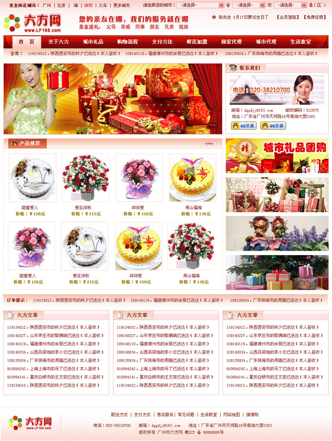 項目名稱:六方網(wǎng)-六度親情網(wǎng)網(wǎng)站改版網(wǎng)站網(wǎng)址:www.lf168.com簽定日期:2010年3月12日《六方網(wǎng)》是一家以本地服務、本地配送為親友送禮的大型網(wǎng)上商城,以城市鮮花蛋糕配送、城市生活用品速遞、城市名品特賣及六方精品專賣為主要經(jīng)營業(yè)