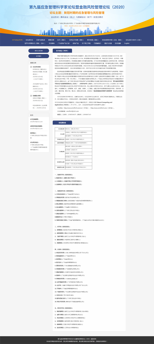 但世界各國的疫情爆發(fā)和蔓延仍然非常嚴重!尤其新冠疫情的發(fā)展導致世界各國的貿(mào)易中斷和產(chǎn)業(yè)鏈的斷裂,我國中小微企業(yè)也在這場疫情的蔓延和發(fā)展中走入了生存的困境!如何有效應對新冠病毒的肆意蔓延和給人類帶來的毀滅性災難?我國中小微企業(yè)在這場疫情的蔓延與發(fā)展中如何走出困境并進行大突圍?這是世界歷史遺留的大難題!為此,由廣州珠江職業(yè)技術學院(下稱:珠江學院)、廣東巴拿赫大數(shù)據(jù)科技有限公司、廣東省公共網(wǎng)絡安全風險評價與預警應急技術研究中心等聯(lián)合主辦,由廣州珠江職業(yè)技術學院應急產(chǎn)業(yè)學院和暨南大學金融工程研究所聯(lián)合承辦的“第九屆應急管理科學家論壇與金融風險管理論壇(2020)”(EMSF&FRF(2020))將于2020年11月14-15日(13日報到)在廣州珠江職業(yè)技術學院和騰訊會議進行線上和線下雙向混合交流。線上主要以科學家論壇為主,線下主要以企業(yè)家論壇為主。誠邀海內(nèi)、外的健康衛(wèi)生、應急管理、經(jīng)濟、金融、計算機、人工智能、金融工程與風險管理等領域的科學家、頂級專家、企業(yè)家、著名學者、青年才俊、博士后、碩博士研究生等,共同探討“新冠時期的應急管理與風險管理”等當前全球緊急解決的難題。