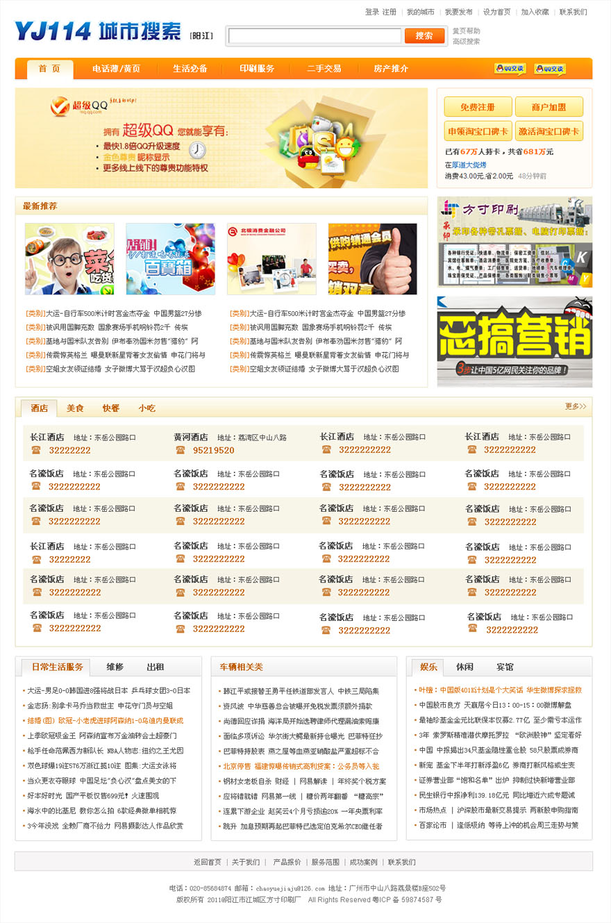 項目名稱:陽江號碼百事通網(wǎng)網(wǎng)站建設(shè)簽定日期:2011年8月12日網(wǎng)址:http://www.yj114.com首頁效果: