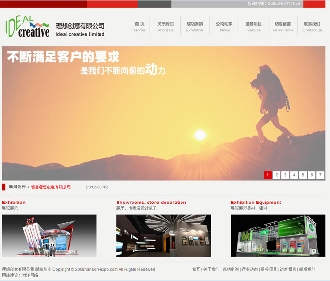 項(xiàng)目名稱:漢森展覽有限公司網(wǎng)站建設(shè)簽定日期:2011年12月20日網(wǎng)址:http://www.ideal-hk.com/漢森展覽有限公司是一家專業(yè)的展覽製作公司,服務(wù)範(fàn)圍以大型展覽會(huì)組織、展覽展示設(shè)計(jì)及工程建造、商業(yè)會(huì)議活動(dòng)與策劃、陳列室裝