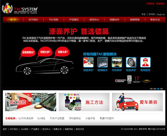 項(xiàng)目名稱:賽伯汽車用品網(wǎng)站建設(shè)簽定日期:2012年2月3日網(wǎng)址:http://www.tacsystemcar.comTACSYSTEM1995年成立于韓國(guó)SOONCHUN,是一家專門研發(fā)、生產(chǎn)、銷售汽車美容用品的綜合性企業(yè)。主要生產(chǎn)和經(jīng)營(yíng)