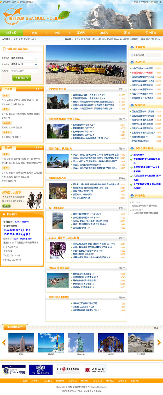 項目名稱:美國海鷗旅游集團公司網(wǎng)站建設(shè)簽定日期:2012年3月2日網(wǎng)址:http://www.haiouholiday.com 美國海鷗旅游集團公司是一家集旅游產(chǎn)品批發(fā)、散客/團體接待和巴士租賃業(yè)務(wù)于一身的大規(guī)模集團公司,總部設(shè)在美國洛杉