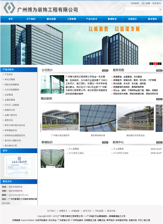 項(xiàng)目名稱:廣州博為裝飾工程有限公司網(wǎng)站建設(shè)簽定日期:2012年7月13日網(wǎng)址:http://www.boweizs.com廣州博為裝飾工程有限公司是由一支在幕墻、輕鋼結(jié)構(gòu)、內(nèi)外裝行業(yè)里拼搏了10年以上的設(shè)計(jì)、施工團(tuán)隊(duì)。在通過(guò)一年多來(lái)的組建與