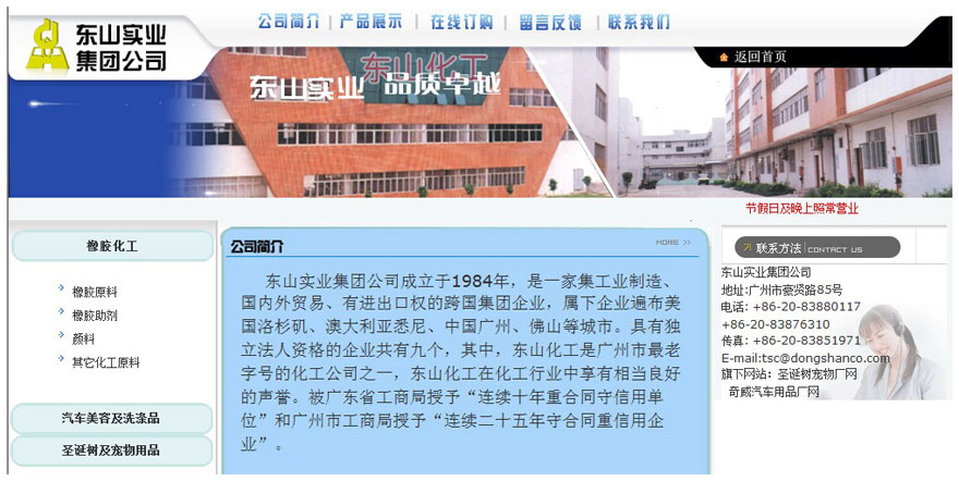 東山實業(yè)集團公司成立于1984年,是一家集工業(yè)制造、國內(nèi)外貿(mào)易、有進出口權(quán)的跨國集團企業(yè),屬下企業(yè)遍布美國洛杉磯、澳大利亞悉尼、中國廣州、佛山等城市。具有獨立法人資格的企業(yè)共有九個,其中,東山化工是廣州市最老字號的化工公司之一,東山化工在化工行業(yè)中享有相當(dāng)良好的聲譽。被廣東省工商局授予“連續(xù)十年重合同守信用單位”和廣州市工商局授予“連續(xù)二十五年守合同重信用企業(yè)”。