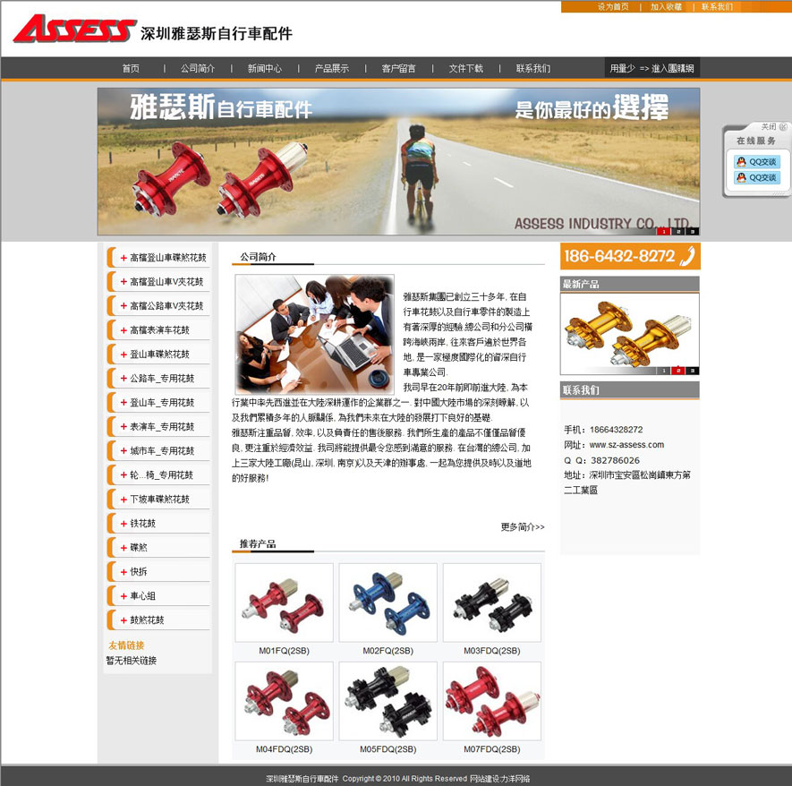 項(xiàng)目名稱:深圳雅瑟斯自行車配件網(wǎng)站建設(shè)簽定日期:2013年3月15日網(wǎng)址:http://www.sz-assess.com/index.asp雅瑟斯集團(tuán)已創(chuàng)立三十多年,在自行車花鼓以及自行車零件的製造上有著深厚的經(jīng)驗(yàn).總公司和分公司橫跨海峽