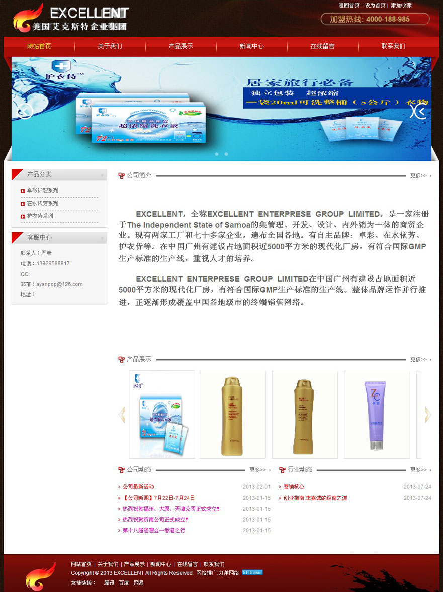 EXCELLENT,全稱EXCELLENT ENTERPRESE GROUP LIMITED,是一家注冊于The Independent State of Samoa的集管理、開發(fā)、設計、內外銷為一體的商貿企業(yè)。現(xiàn)有兩家工廠和七十多家企業(yè),遍布全國各地。有自主品牌:卓彩、在水依芳、護衣侍等。在中國廣州有建設占地面積近5000平方米的現(xiàn)代化廠房,有符合國際GMP生產標準的生產線,重視人才的培養(yǎng)。