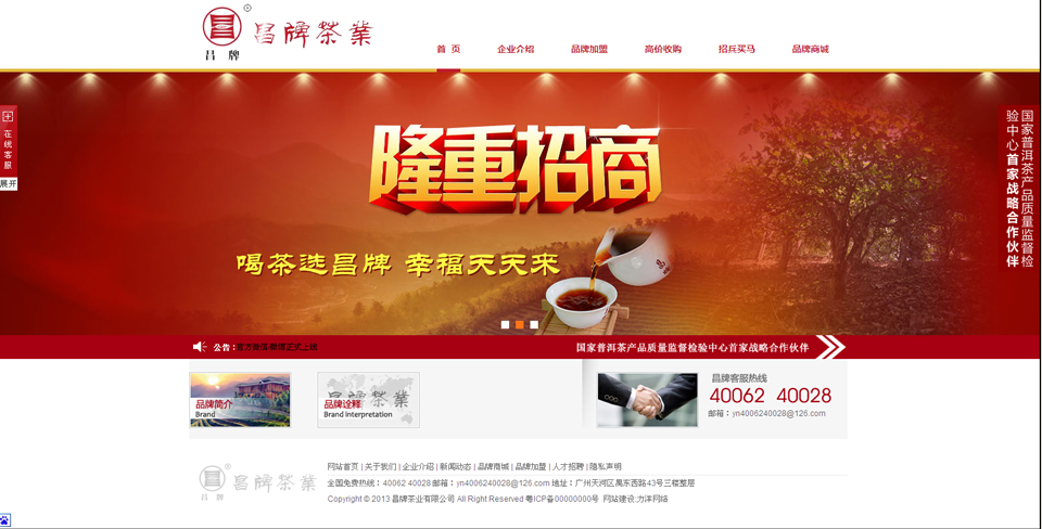 項(xiàng)目名稱:昌牌茶業(yè)有限公司  簽定時間:2013-10-08  項(xiàng)目網(wǎng)址:http://www.4006240028.com/  項(xiàng)目簡介:  昌牌茶業(yè)以綠色健康產(chǎn)業(yè)為中心,秉持高標(biāo)準(zhǔn)“一心一意做好茶”的經(jīng)營理念